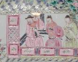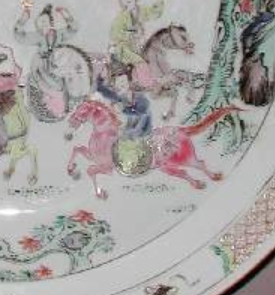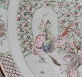 这是一件清代雍正年间的粉彩大盘,直径 31 厘米,高 5 厘米,现处于存储状态。盘身采用硬质瓷制成,敞口,弧腹,宽折沿。盘内以粉彩及描金工艺装饰,主图案为三位官员立于精致亭台的露台上,俯瞰六位手持棍棒骑马疾驰的仕女,一侧有缠花格子门;折沿饰有交替的方格与锦纹地纹,其间点缀 “四艺”(琴棋书画)纹、法轮与磬纹等吉祥图案,色彩涵盖粉、蓝、绿、黄、黑、白、茄紫、棕、等,色调柔和,金彩点缀其间,尽显雍容华贵。