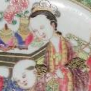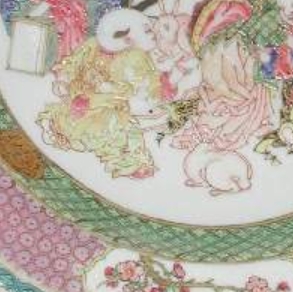 这是一件清代雍正年间的 “红宝石背” 风格粉彩碗,直径 20.7 厘米,高 3.4 厘米。碗身采用硬质瓷制成,弧腹浅坦,宽折沿。碗心以粉彩及描金工艺装饰,主图案为三位童子在一位端坐的仕女旁嬉戏,周围有储物罐、置有香炉与牡丹瓶的桌案,地面有两只浅红色兔子;碗壁内侧饰浅绿色格子锦地纹,其间点缀四个描金龙纹圆章;折沿则以淡紫色方格锦地为边,预留四个花卉小景,外围环绕浅蓝色格子锦带,色彩涵盖粉、蓝、绿、黄、黑、白、茄紫、棕、铁红等,金彩点缀其间,尽显精致典雅。
