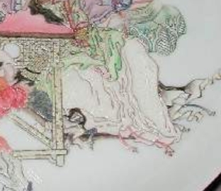这是一件清代雍正年间的 “红宝石背” 风格粉彩,直径 20 厘米,高 3.5 厘米,现处于存储状态。碟身采用硬质瓷制成,浅腹外敞,边缘带唇,下承矮圈足。碟内以粉彩及描金工艺装饰,主图案为一位仕女端坐于竹桌旁(肘部倚桌),桌上陈列 “百宝”(器物,周围有大型储物罐;仕女俯视两名童子,一人手持金杖,另一人吹奏竹笛。碟的背面(外侧)施深玫瑰红色釉,整体色彩涵盖粉、蓝、绿、黄、黑、白、茄紫、棕、铁红等,金彩点缀其间,纹饰细腻,色调和谐。