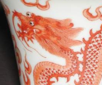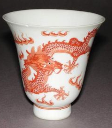 该高足杯制作于雍正时期(1723-1735 年),是清代官窑风格瓷器的典型作品。雍正朝制瓷工艺精湛,矾红彩作为重要的釉上彩品种,常用于表现龙纹等皇家题材,而五爪龙在清代是皇室专用纹饰,象征皇权至高无上,此杯的纹饰与工艺特征,反映了当时宫廷用瓷的严格等级制度与审美取向,对研究清代雍正时期制瓷工艺、皇家纹饰规制具有重要参考价值。