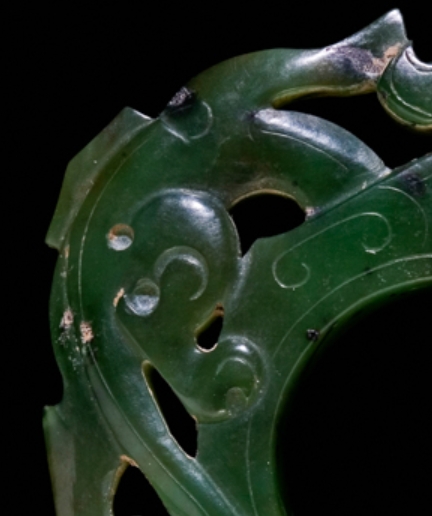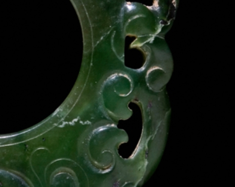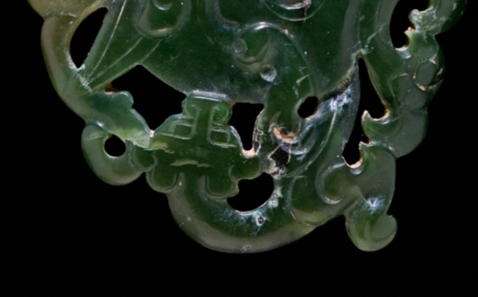 该饰物制作于 1600-1800 年(明至清代),收录于《不朽之石 —— 中国玉器从新石器时代到二十世纪》(第 127 页)。明至清代是玉器工艺的鼎盛时期,透雕玉佩作为常见的装饰与佩戴器物,既体现了当时的审美取向,也反映了玉雕工艺在题材选择与技法运用上的成熟,对研究这一时期玉器的造型渊源、纹饰寓意及工艺传承具有参考价值。