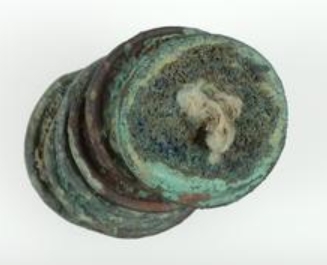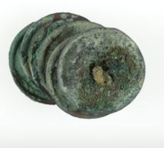 这是一组推测为北宋时期(960-1127 年)的铜钱,共 6 枚,串在一起且因长期锈蚀相互粘连,总重 43.15 克,现存放于菲茨威廉博物馆的存储区域。钱币材质为铜,属于中国古代典型的方孔铜钱,其造型遵循传统的圆形方孔形制,这一设计既便于穿绳携带,也蕴含着古代 “天圆地方” 的宇宙观,是北宋时期社会经济活动中广泛流通的货币形式。