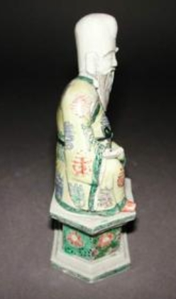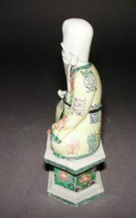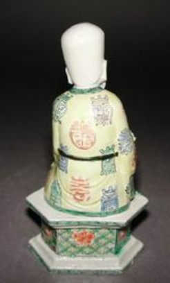 该寿星像制作于康熙年间(1662-1722 年),这一时期是清代珐琅彩瓷工艺的兴起阶段,瓷塑人物兼具宗教寓意与装饰功能。寿星作为象征长寿的传统题材,其形象在明清瓷器中常见,此像的工艺特征对研究康熙时期珐琅彩技法、瓷塑造型设计及民间信仰表达具有参考价值,反映了当时制瓷业的高超水平与社会文化取向。