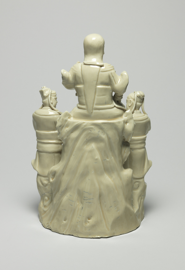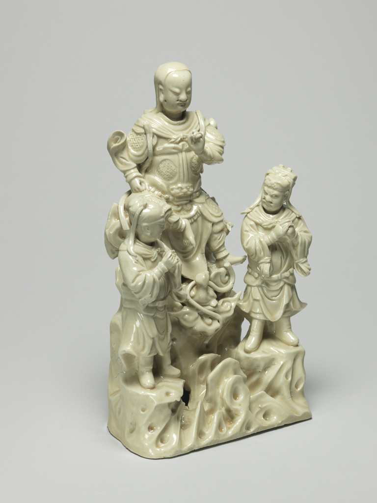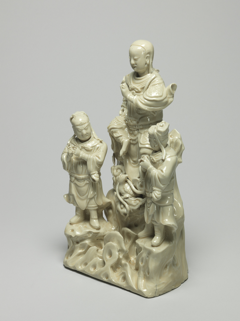 这是一件 16 世纪晚期(约 1575-1599 年)的德化白瓷真武大帝群像。器物塑造了端坐的真武大帝,身旁有站立的武士侍从,下方复杂的岩基上伴有龟与蛇的造型,整体组合体现了道教文化中真武大帝的经典形象,造型生动,细节丰富,展现了明代晚期德化窑白瓷在人物塑造上的精湛工艺。
