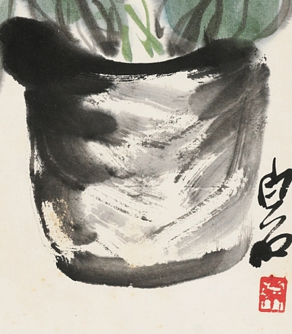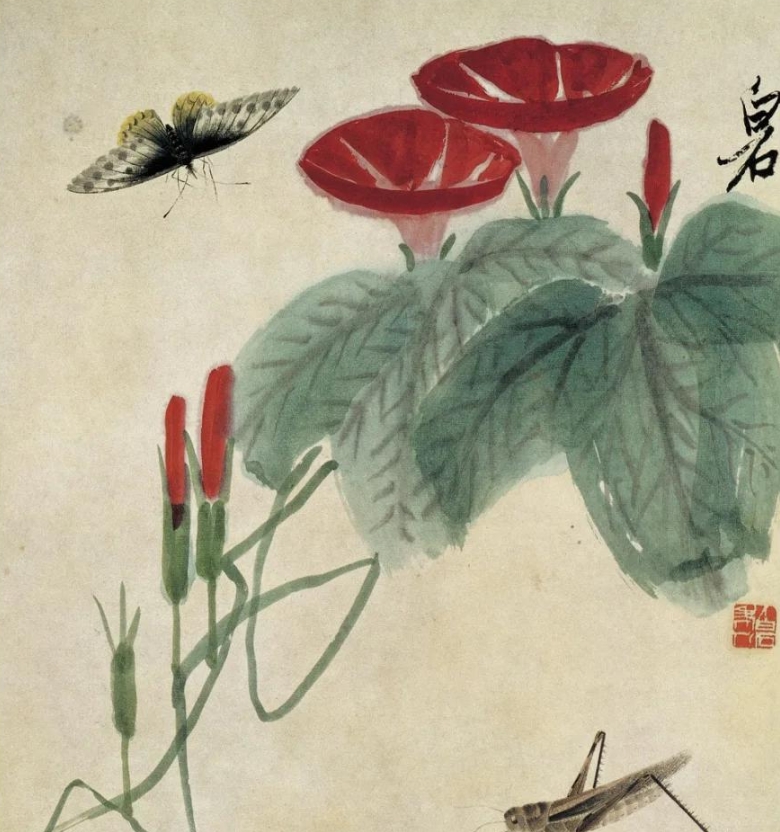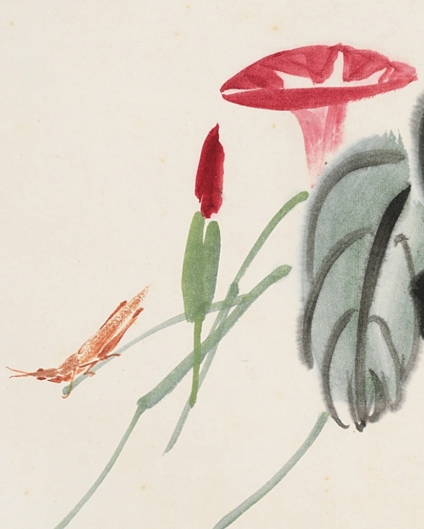 齐白石始画牵牛花,缘于最初在梅兰芳宅院见到竟如碗般大的牵牛花。此幅为齐白石最早的牵牛花作品之一,画赠齐、梅二人相识的牵线者齐如山,四朵牵牛花大如碗,清爽利落,有天然之态。