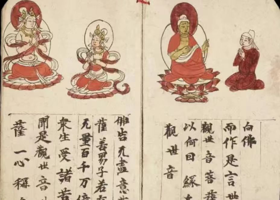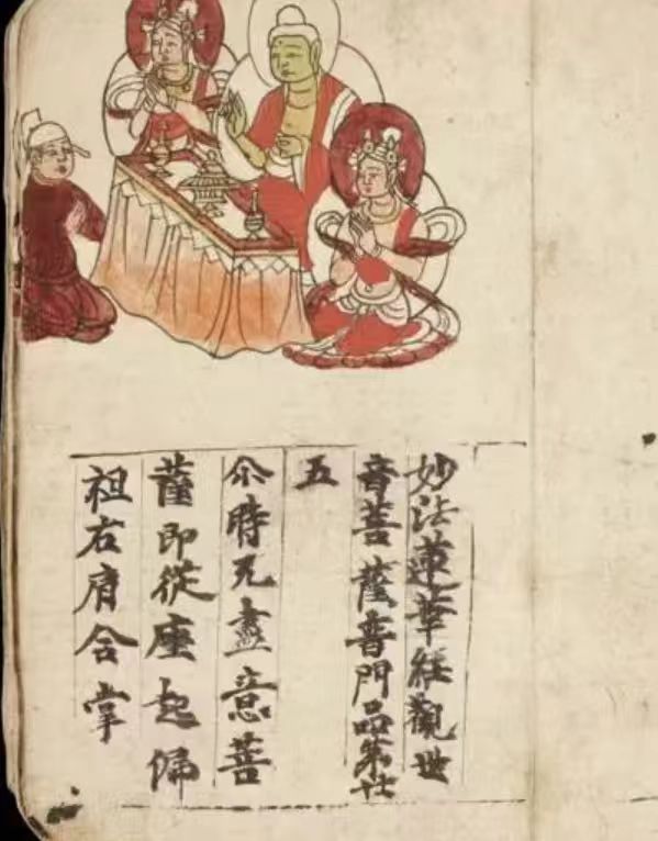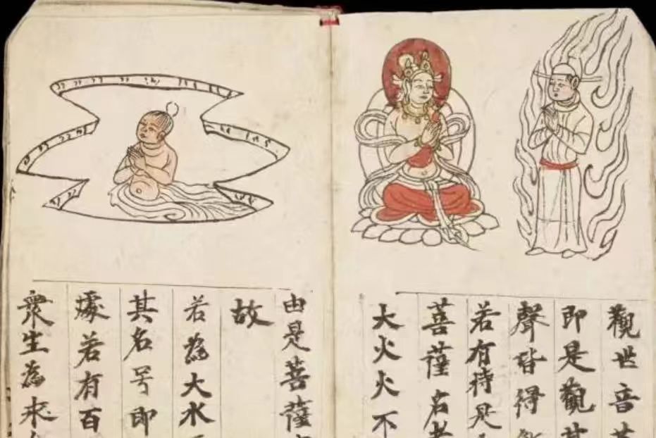 敦煌遗书中的手绘插图式,《妙法莲华经·观世音菩萨普门品》,共有五个版本留存于世。其中有四个彩绘插图版本和一个白描插图版本。英国斯坦因收集了其中的一个彩绘插图版本和一个白描插图版本。