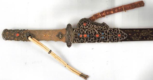 此刀制作于公元8世纪中叶唐玄宗天宝年间(742-756年),属唐代宫廷作坊特制的礼仪刀具,与陕西法门寺地宫出土的鎏金银器属同一工艺体系。754年由遣唐使吉备真备携归日本,作为国礼献给圣武天皇。756年圣武天皇驾崩后,其遗物入藏东大寺正仓院,《东大寺献物帐》(编号:北仓38)明确记载“金银钿装唐大刀一口”,与吴竹竽、螺钿紫檀琵琶等同批纳入皇室珍宝,代表唐代“十部伎”乐舞仪典的贵族兵器配置