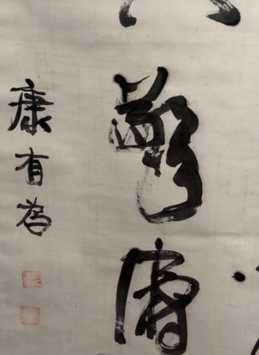 康有为(清末民初)的《念奴娇·赤壁怀古》行书立轴,以水墨纸本为载体,纵132厘米、横32厘米。此作淋漓尽致展现其"康体"书法精髓:结字取法北碑《石门铭》的开张之势,中宫疏朗而四维外拓,字形如磐石般稳健又具放射感;运笔中侧锋并用,线条浑厚如铸铁,转折处见魏碑方峻之气,飞白处显金石斑驳之韵;章法上字密行疏,墨色枯润相生,将苏轼词作的豪放气概通过碑帖交融的笔意完美诠释,堪称晚清碑学运动的典范之作。