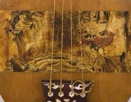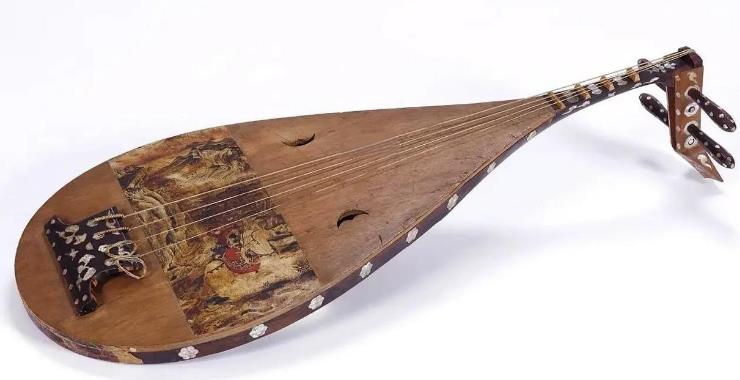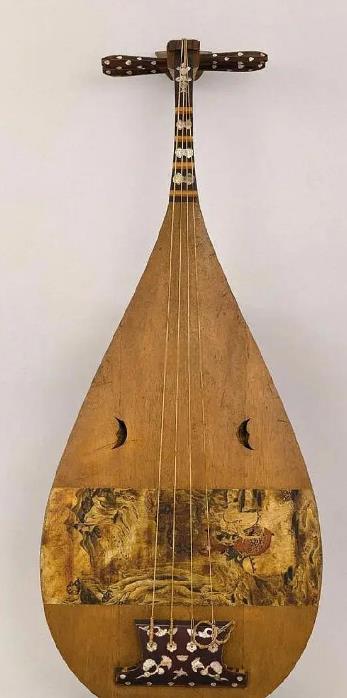 正仓院藏螺钿紫檀四弦琵琶(枫苏芳染螺钿槽琵琶)为盛唐宫廷乐器典范,全长约98厘米,梨形琴身由整块紫檀木雕凿而成。琴体通体施黑漆,琴颈呈直角曲项,背板以厚度仅0.6毫米的夜光贝、青贝镶嵌菱形花鸟螺钿纹,局部贴嵌玳瑁与琥珀增强光影层次。琴面设捍拨(拨弦护板),为皮质彩绘《胡人骑象奏乐图》,采用密陀绘技法以矿物颜料绘制,远景山水以金泥勾线,体现唐画"青绿金碧"风格。经CT扫描,琴腔内部设有双共鸣箱结构,与现代琵琶的"缚手"声学原理相通