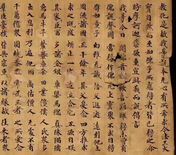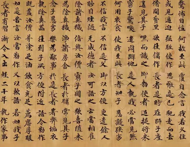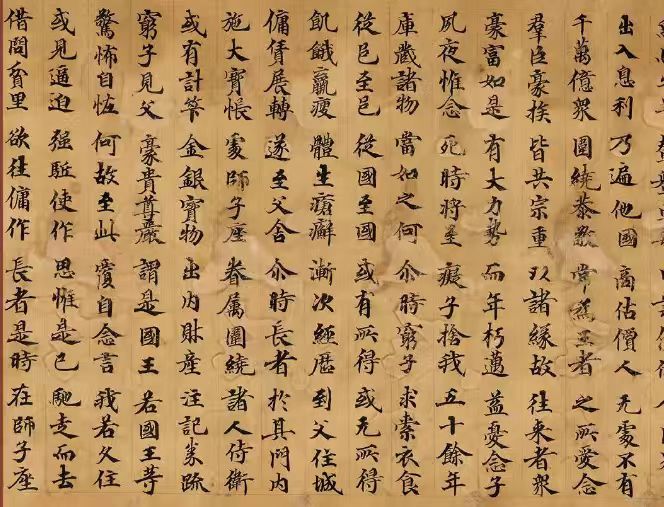 此段出自《妙法莲华经·信解品第四》编号S.00027,此卷长326cm,高24cm,首断尾残,存八纸,第一纸10CM存六行,第二纸47CM,第三纸47.2CM至,第四纸47.5CM,第五纸47.1CM,第六纸47.4CM第七纸47.3CM,第八纸32.1CM.