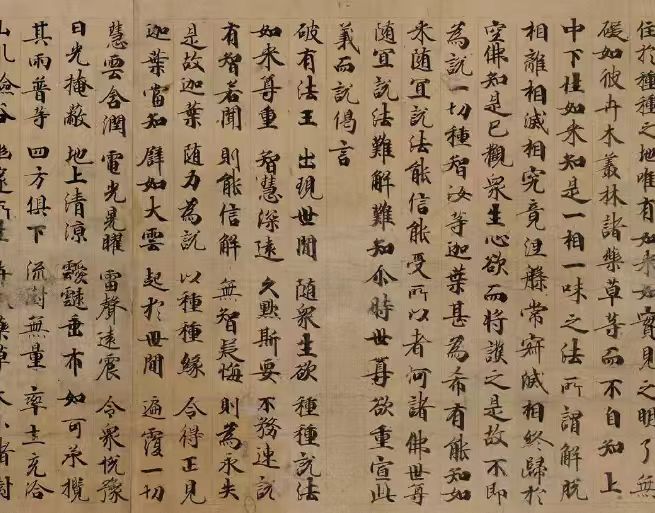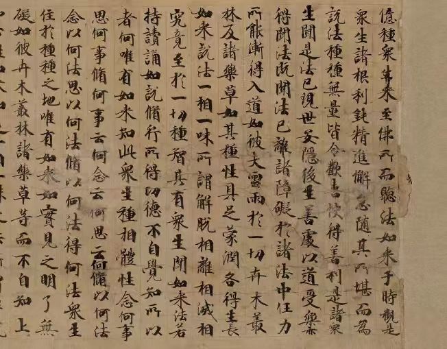 此段出自《妙法莲华经》的《授记品第六》与《化城喻品第七》。纸张为传统手工麻纸或皮纸质地,历经岁月侵蚀,整体呈古朴的黄褐色,纸面略有自然磨损、褶皱,部分边缘因长期卷舒出现细微残破。书写方式遵循古代写经规范,以竖排书写,字列整齐有序。墨色历经时光沉淀,呈现出深沉且富有层次的色泽,部分字迹因年代久远、空气氧化等,墨色稍显晕染或变浅,却无损整体文字辨识度。字体为成熟的写经体楷书,笔画规整严谨,横画收放有度,竖画挺拔劲健,撇捺舒展灵动,遵循严谨书写规范,展现出唐代(或对应朝代)写经书法的典型风格