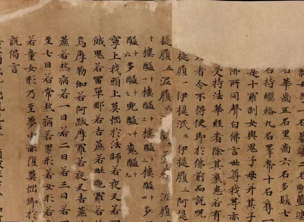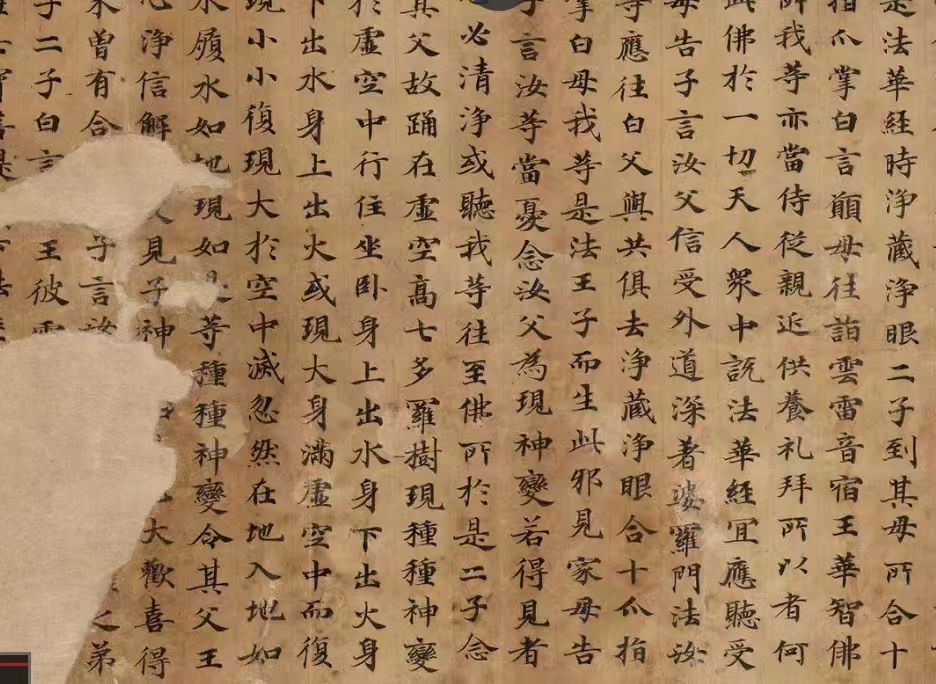 这段经文主要讲述了多位菩萨、天王和罗刹女发愿保护诵读、修持《法华经》的人,后段讲述古佛时代的故事:妙庄严王沉迷外道,其妻净德与两个儿子,编号S.00040。本段出自《妙法莲华经》第二十六品《陀罗尼品》与第二十七品《妙庄严王本事品
