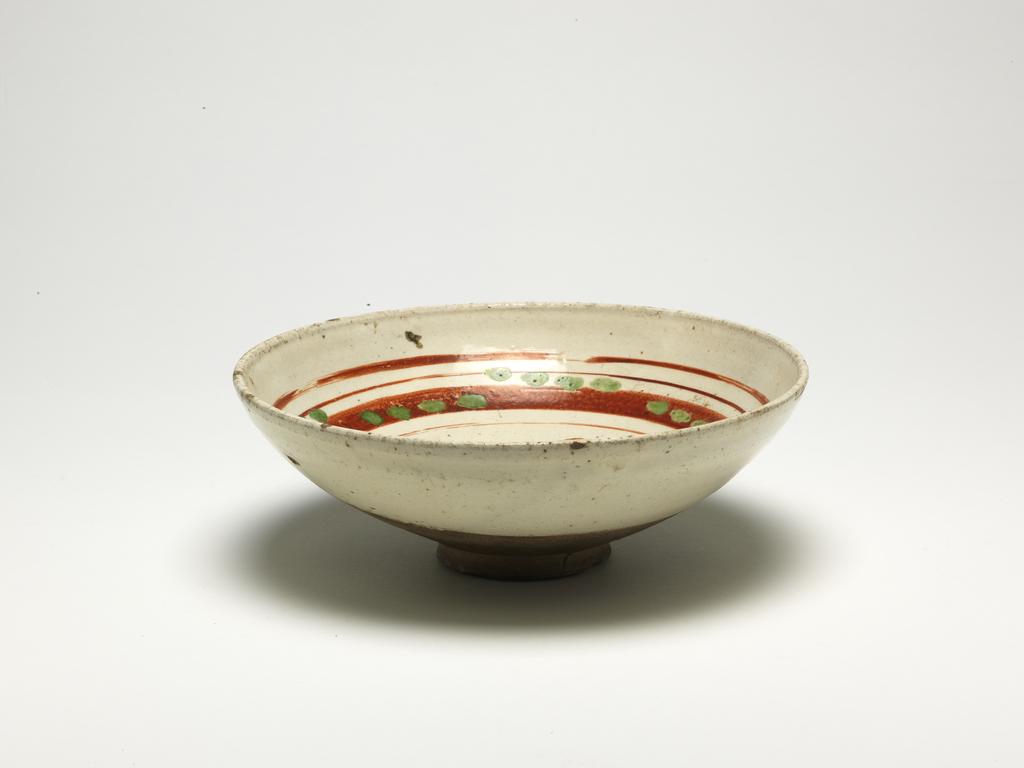 这是一件宋代(960-1279 年)的石胎碗,直径 16.2 厘米,高 6 厘米,现陈列于菲茨威廉博物馆亚洲艺术展厅(Gallery 28)。器物以石胎为材质,胎色呈黄褐色,质地坚硬光滑,通体施白釉;碗身装饰有红色与绿色的花卉图案,外围以四道环形边框,属磁州窑风格,体现了宋代民间瓷器在实用与装饰结合上的朴素特点。