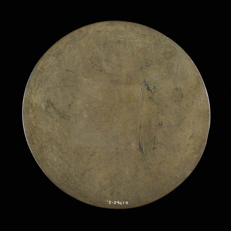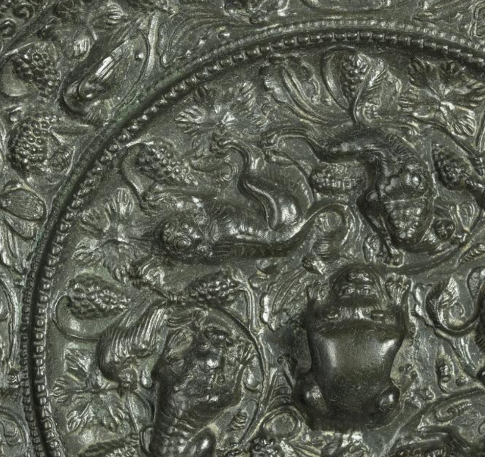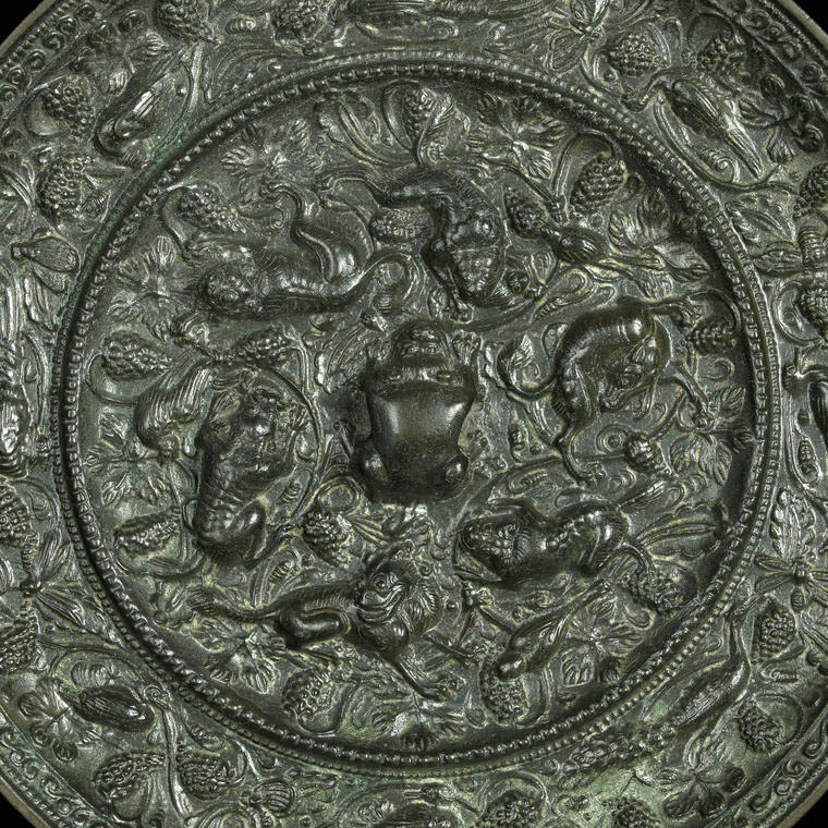 这是一面青铜镜,直径 17.5 厘米,现陈列于菲茨威廉博物馆亚洲艺术展厅。器物以青铜为材质,表面呈黑漆古色,采用高浮雕工艺装饰:中心为熊形钮,周围一圈有 6 只似狮子的动物,边缘饰有藤蔓、葡萄与鸟类纹样,镜缘高且厚重,整体纹饰繁复精美,展现了古代铜镜制作的精湛工艺。