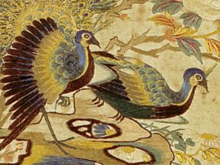 18 世纪末至 19 世纪初的清代晚期至民初,扇类器物既是实用纳凉工具,也是贵族与文人的随身雅物,融合多种工艺的扇子常作为身份与品位的象征。这件屏风扇的花鸟题材(孔雀、牡丹等)寓意吉祥富贵,反映了当时社会的审美取向,对研究这一时期手工艺、装饰题材及生活风尚具有参考价值。