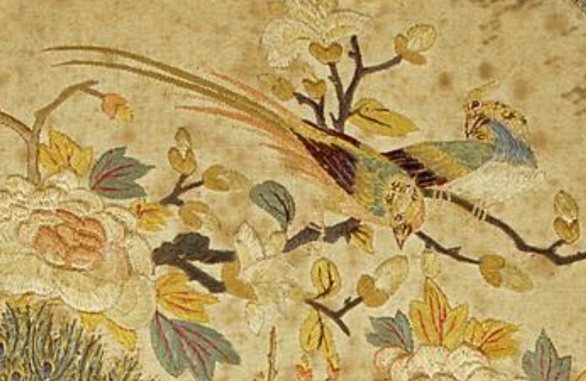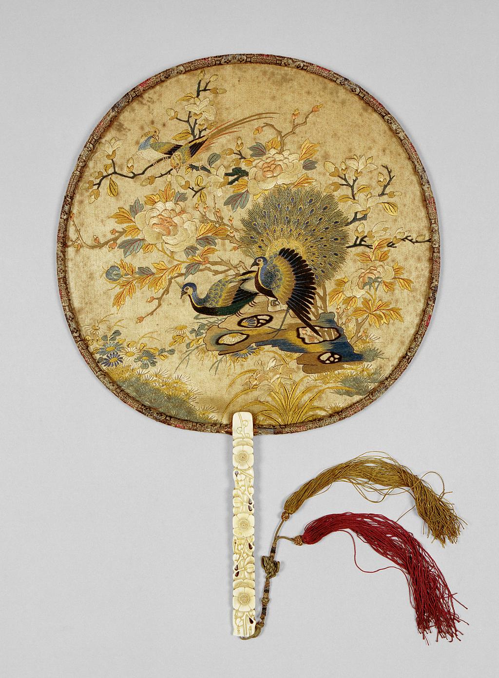 这是一件 18 世纪末至 19 世纪初(1770 年后 - 1830 年前)的屏风扇,宽 26.6 厘米,扇骨高 40.3 厘米,现处于存储状态,属扇类器物。器物由多种材质构成:扇骨为象牙,经浮雕与透雕工艺制成,造型似开花的梅枝;扇面为缎地,以彩丝刺绣孔雀、黄鹂、盛开的牡丹、木兰及山石图案;扇缘覆有织锦,扇绳为绿色丝线打结,缀有红金流苏,配有镀金纸包裹的滑动绳扣,整体工艺繁复,纹饰精美。