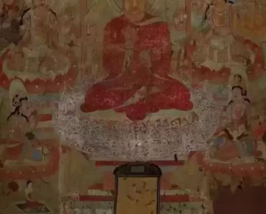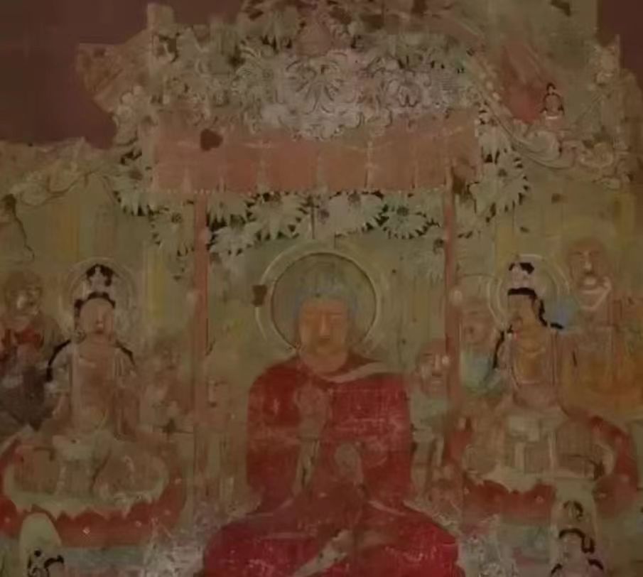 唐代, 高139厘米,宽101.7厘米。整个画面以红色为主色调,渲染出一种静穆庄严的感觉,释迦牟尼端坐中央,各位菩萨分列两侧,倾听佛祖说法。