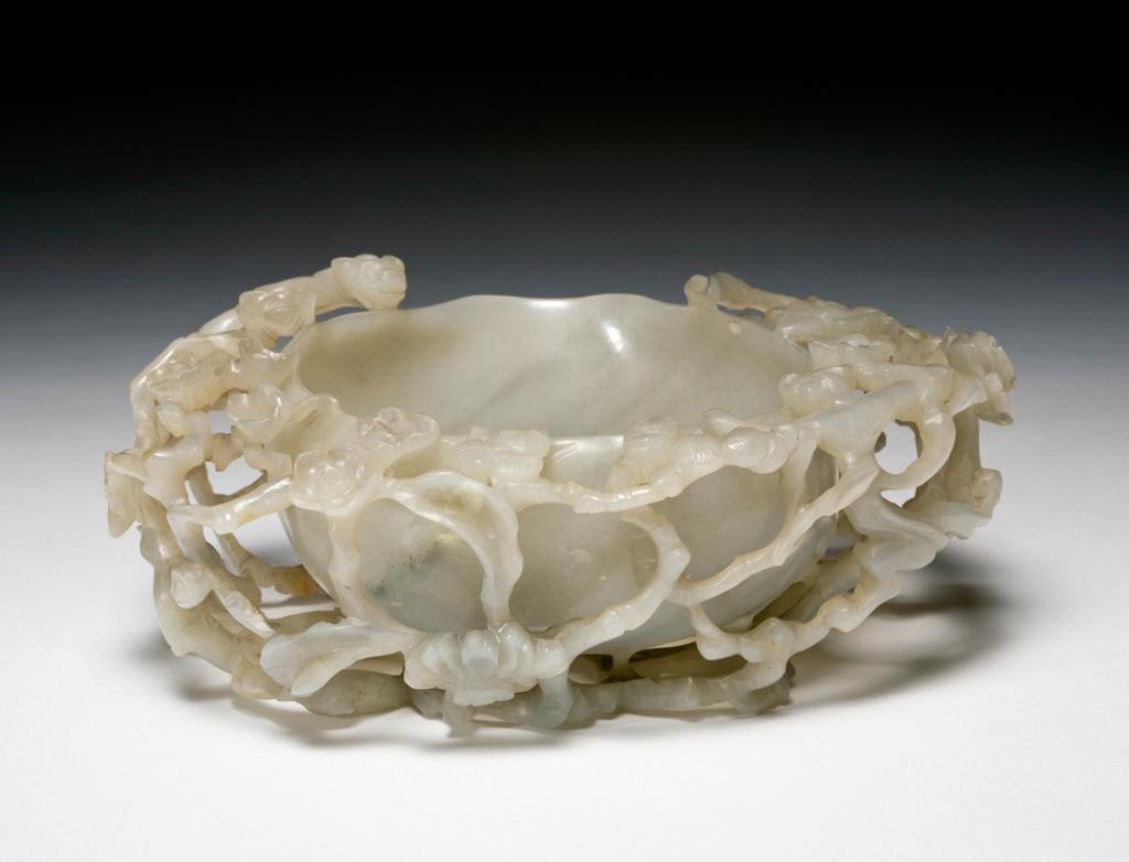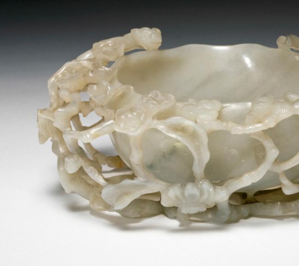 这是一件 16 世纪(1500-1600 年)的玉杯,高 6.2 厘米,长 16.5 厘米,现处于存储状态,属玉器类别。材质为淡白色软玉,采用掏空与雕刻工艺,杯身由盘曲的梅树枝干构成,梅花从枝干底部延伸而出,造型自然。因不便握持,推测非实用饮具,可能是文人案头的笔洗或纯装饰摆件,用以彰显工艺或主人财力。