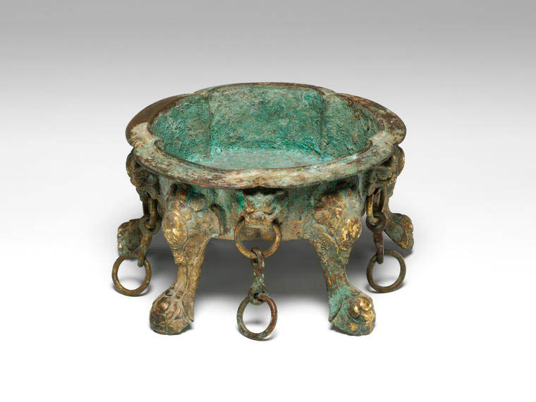 这是一件唐代(618-907 年)的鎏金铜香炉,高 13.3 厘米,宽 25 厘米,现陈列于菲茨威廉博物馆亚洲艺术展厅,属青铜器类别。炉体呈五花瓣形,器壁垂直;底部有四条弯曲的兽形足支撑;炉口为外翻的五瓣花形边缘;器身两侧有镂空兽面托架,各足间悬挂链条,整体造型精巧,鎏金工艺使其色泽华贵。