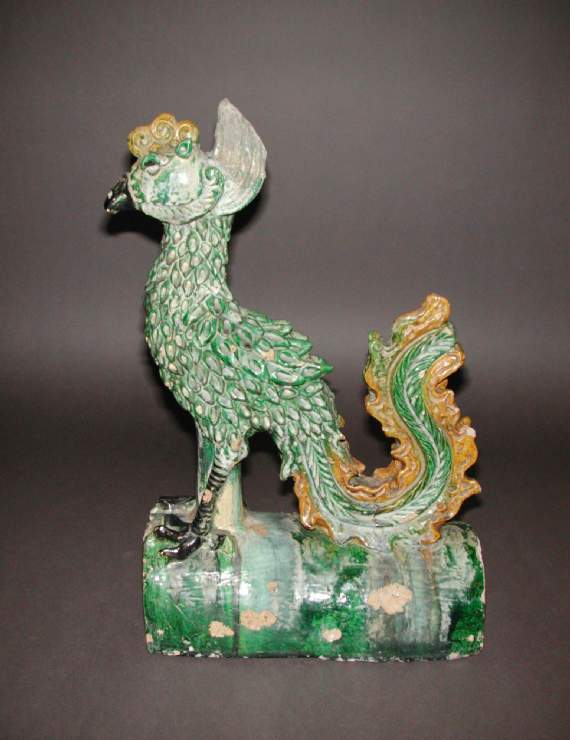 这是一件鸟形脊瓦,高 40.6 厘米,长 29.2 厘米,现陈列于菲茨威廉博物馆亚洲艺术展厅(Gallery 28),属陶器类别。器物整体塑造成鸟的形态,表面施有绿色与黄色釉料,釉色搭配鲜明;作为脊瓦,其功能是安装在建筑屋脊上,既起到固定屋脊结构的作用,又通过仿生造型美化建筑外观。