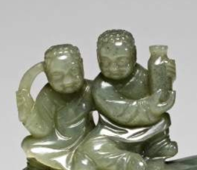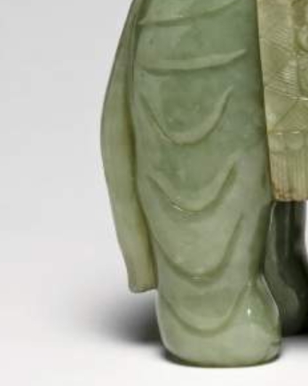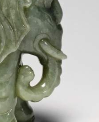 这是一件 19 世纪(1800-1900 年)的青玉雕摆件,高 17.5 厘米,长 16.5 厘米,现处于存储状态。玉质呈浅菠菜绿色,主体雕刻为一头披挂鞍鞯的站立大象,鞍布两侧各饰有一只从海浪中浮现的蝙蝠,象背上有两位僧人,分别手持花瓶和象牙。大象身体与腿部的褶皱皮肤以深式褶皱纹路表现,整体充满象征。