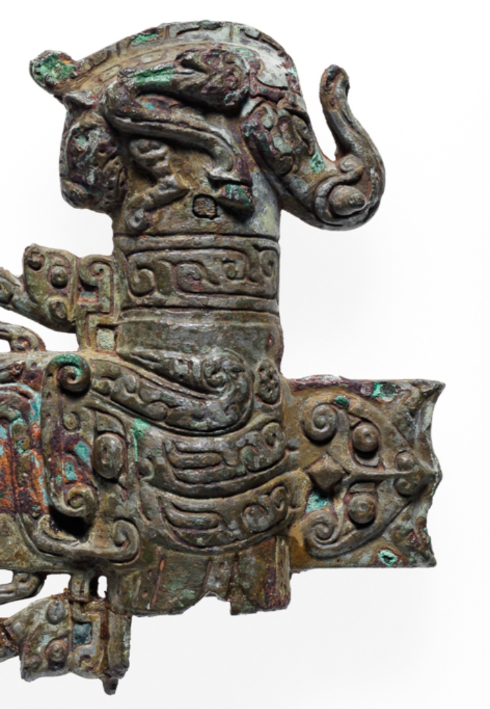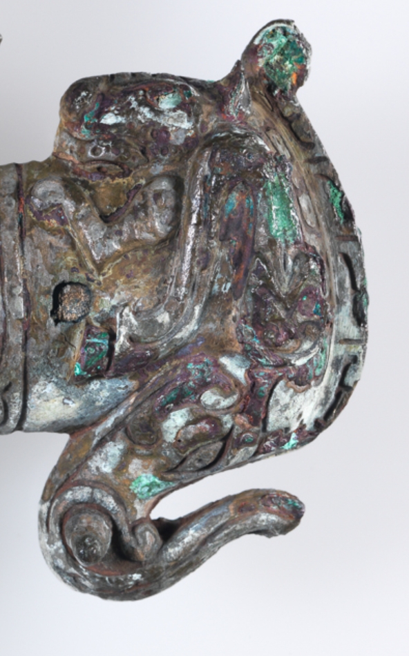 这是一件周代(约公元前 500 - 前 249 年)的青铜斧,高 11.1 厘米,长 14.6 厘米,现处于存储状态。刃部、斧銎及銎帽为整体铸造成型,刃部两侧饰有老虎纹饰,刃面刻有盘绕的龙纹、程式化龙头及饕餮纹;銎帽上有象首图案,搭配马腿与后部的虎头纹饰。器物整体纹饰繁复,融合龙、虎、象等动物元素,展现了周代青铜器 “狞厉之美” 的装饰风格与高超铸造技术。