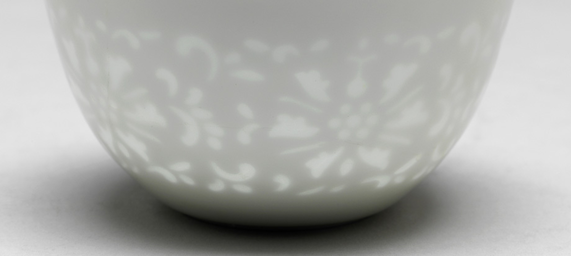 这是一件清代嘉庆年间(1800-1820 年)的硬瓷杯,直径 6 厘米,高 3.8 厘米。属米纹瓷品类,通体呈白色,杯身带有透雕装饰,透雕缝隙处填满乳白色釉料,釉面光滑。整体造型小巧,透雕工艺与施釉技术的结合,既展现了制瓷的精细技巧,又兼顾了实用饮具的功能需求。