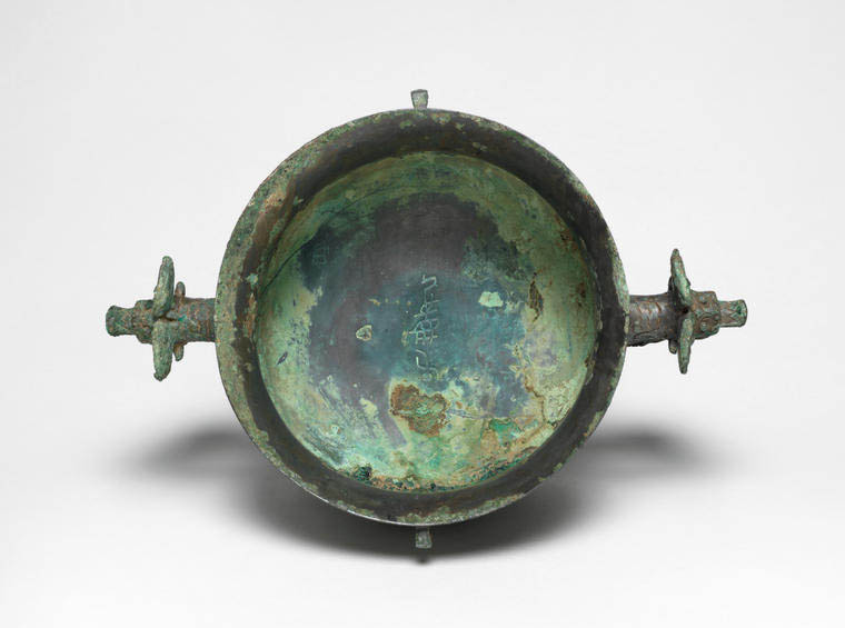 这是一件约公元前 1200 - 前 1100 年(商周时期)的青铜簋,高 13.3 厘米,宽 26.6 厘米,为食器类礼器,带有铭文。器身碗部有高圈足,设两个龙首形环耳,耳下饰有一动物(可能为羊);器身分为四部分,每部分以相抵的龙头构成饕餮纹;上部饰有钩鼻龙纹带,下部为爬行龙纹带,口沿顶部有蝉纹。整体纹饰繁复精美,融合龙、饕餮、蝉等典型商周青铜纹饰,展现了高超的铸造与雕刻工艺。