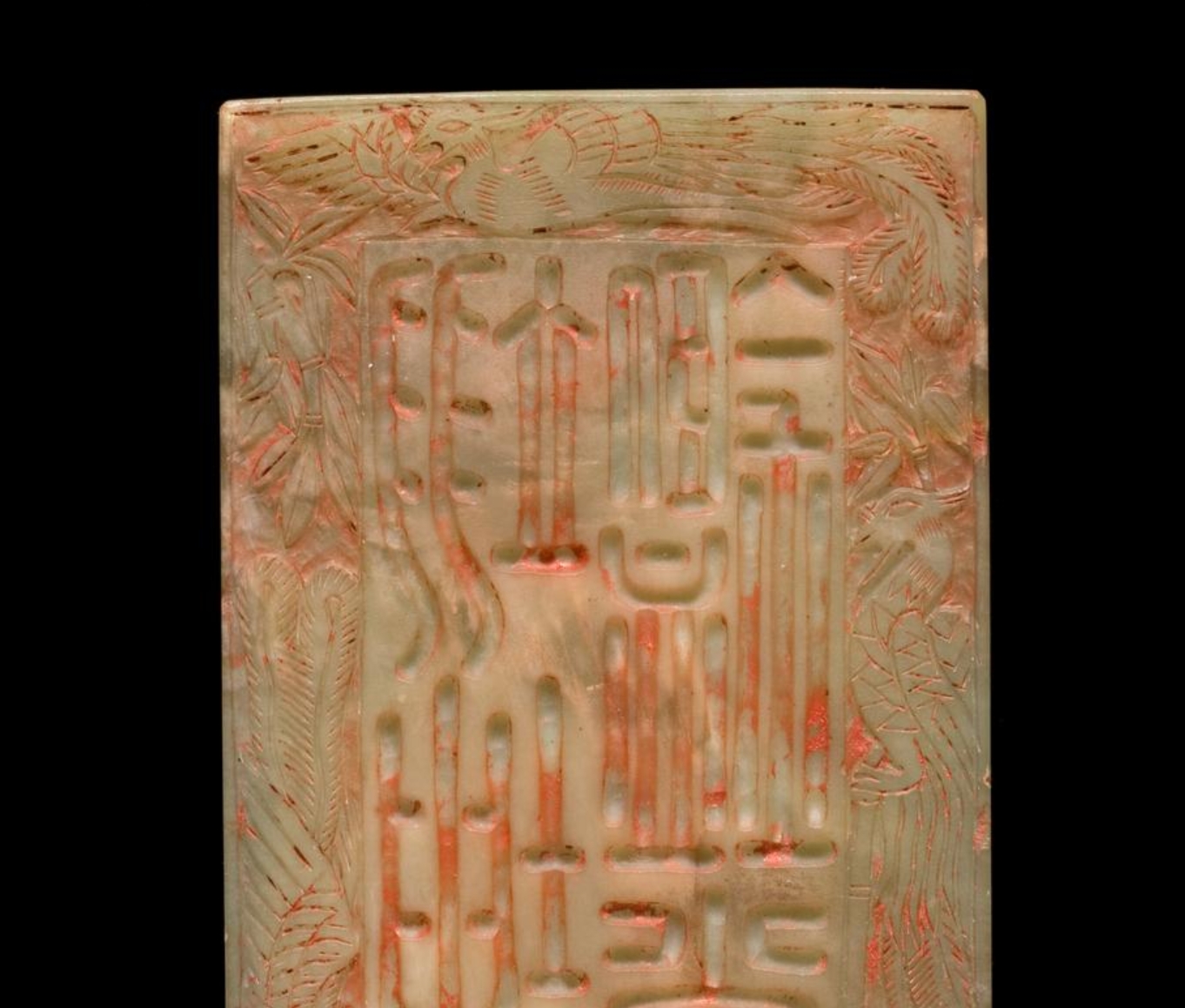 这是一件 19 世纪(1800-1899 年)的玉印,高 9.8 厘米,长 14.5 厘米,宽 6.9 厘米,现处于存储状态。玉质呈浅绿色,部分区域蚀变为奶白色,印纽为双龙背靠背造型,中央钻有孔洞用于穿系流苏绳(绳结由北京大喇嘛所系)。印底刻有 “翊坤宫鉴赏” 字样,周围环绕凤鸟与竹子纹饰,配有黄色丝绸封套。作为宫廷用印,其与 O.105-1946 号玉印相互印证,功能上用于慈禧太后对宫廷入藏艺术品的审定 —— 经她认可的艺术品会加盖此印,随后被购入收藏。