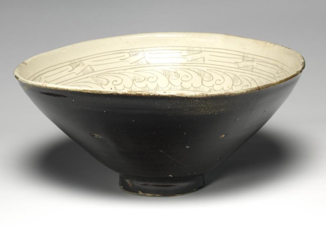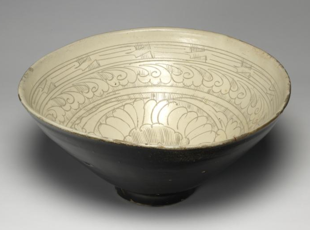 宋代是磁州窑发展的鼎盛时期,作为民间窑场的代表,其瓷器注重实用与装饰的结合,刻花、釉色搭配等工艺灵活多样,产品广泛应用于日常生活。这件碗的纹饰题材(花卉、云纹)贴近自然与生活,反映了宋代民间审美取向,而炻器材质的选用和釉色对比技法,体现了磁州窑在原料利用与工艺创新上的特点。