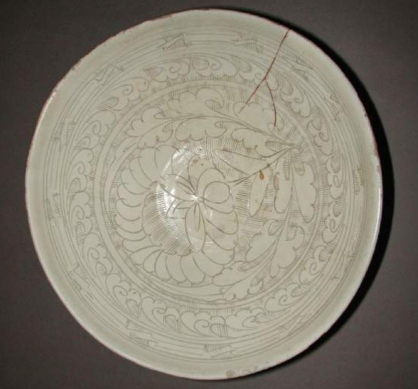 这是一件宋代(960-1279 年)的炻器碗,直径 27.3 厘米,高 12.1 厘米,现处于存储状态。碗体宽大,质地坚硬,呈浅黄色,外部施黑釉,内部以白色釉为地,通过刻花工艺装饰有一朵花卉图案,花卉周围以云纹边框环绕。刻花工艺使纹饰在釉面形成鲜明对比,展现了磁州窑 “白地黑花” 之外的另一种装饰特色,既具实用功能,又兼具装饰美感。