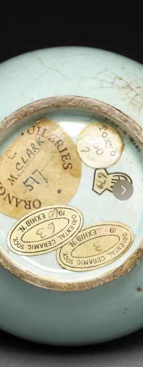 北宋玉壶春瓶可能是从唐代佛教青铜和白色器皿烧瓶发展而来的(例如,参见BM1909.0401.76)。这种形状一直延续到南宋和元代,当时来自中国南方的瓷器版本用雕刻或绘画装饰。北宋单色花瓶的比例因窑而异,这一例子与陕西耀州瓷器最为接近。形状显示高品质釉的优势;这件瓷器上厚厚的、光滑的鸭蛋蓝色釉覆盖了除足环以外的整个容器。