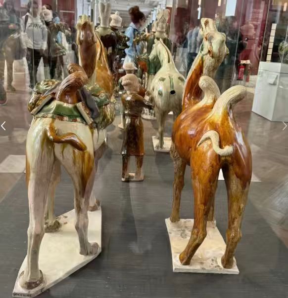 靴,直立在方板上;双臂屈置胸前,双手握拳,作执缰绳姿势,似在牵骆驼或牵马。在牵夫俑的两侧各有一匹马俑,一对则极具中国特色,为直立的两个人俑,一位武官,一位文吏,两位皆身着广袖长袍,腰束带,双手置于是用来执笏板的,神情肃穆庄重,文官可能承担起草刘庭训的墓志铭,并将其呈交给阴间的判官的工作。两匹彩马釉色明亮,躯体丰肥适度,骨肉匀停,两耳上耸,双目圆睁,立于托板之上,展现出伫立 时宁静的神态。一匹高约85厘米,造型大胆,身体中空,颈背部仍见有凹槽,原先饰有毛发制成的鬃毛;尾部的小孔原先用来放置毛发制成的马尾,一匹乳白色带黄绿斑点,一匹通体棕色,可以看出这是通过丝绸之路到来的中亚名贵新品种。殿后的是一对漂亮的大夏双峰驼,驼峰一左倾,一右倾,驼首上昂,双目圆睁,张嘴作嘶鸣状,腰身略长,四肢立于方形托板之上。其中一只高约86厘米,通体以棕色釉为主,间施绿、黄诸色,深浅变化不同,原先双峰之间配有皮制鞍垫,另外一只高约84厘米,釉彩以棕、绿色为主,背上有毡垫,两峰之间搭挂驮囊,上饰兽面图案,囊袋两侧挂有各种物品,有丝束、水壶,还有一些肉类作为穿越丝绸之路的食物补给。驼俑引颈张口,四肢作行走状,生动再现了丝绸之路上驼队不畏艰险、长途跋涉的真实景况。