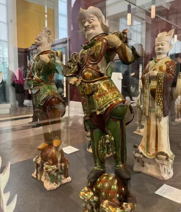 这是迄今为止发现的最大最完整的一套唐三彩,天王跟文武二官的高度100厘米左右,按唐代规制,这是正二品官员才能使用的规制。- 相关背景:大英博物馆的13件唐三彩陶俑出自唐朝名将刘庭训之墓,刘庭训曾任唐朝忠武将军、河南道与淮南道校尉及中央枢密使,公元七二八年七十二岁去世。刘庭训的仕途期正处于唐朝鼎盛时期。唐朝时期的中国,与中东阿拔斯王朝的伊斯兰帝国一起,建立了西起摩洛哥、东至日本的庞大的奢侈品专营市场。两大帝国一度统治并塑造了中世纪早期的世界。同时期的欧洲尚处于小国与城邦林立的混乱时期,而唐朝作为一个统一的国家,疆域北至朝鲜,南至越南,向西循丝绸之路一直延伸至中亚。强大的实力以及对自身文化的自信,在这组陶俑中得到了生动的体现。