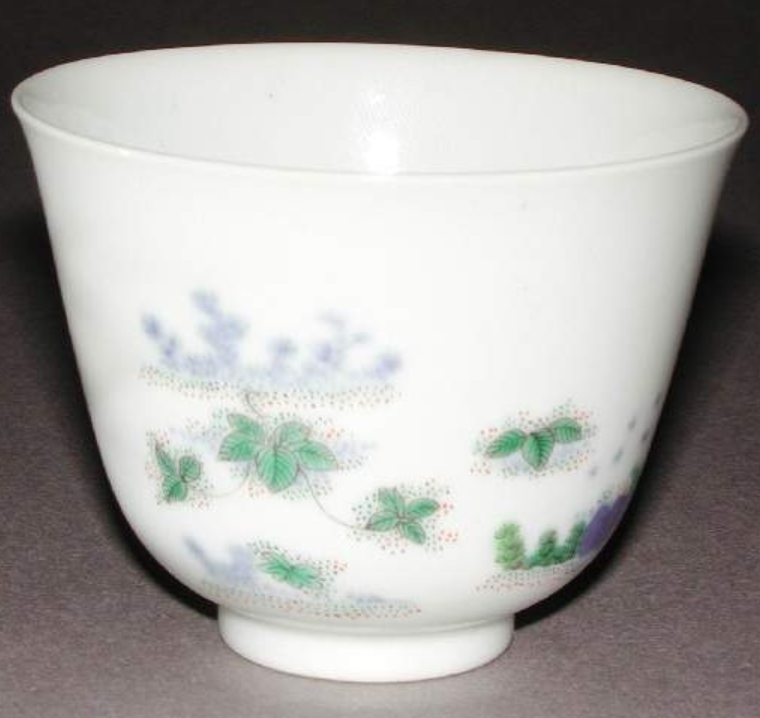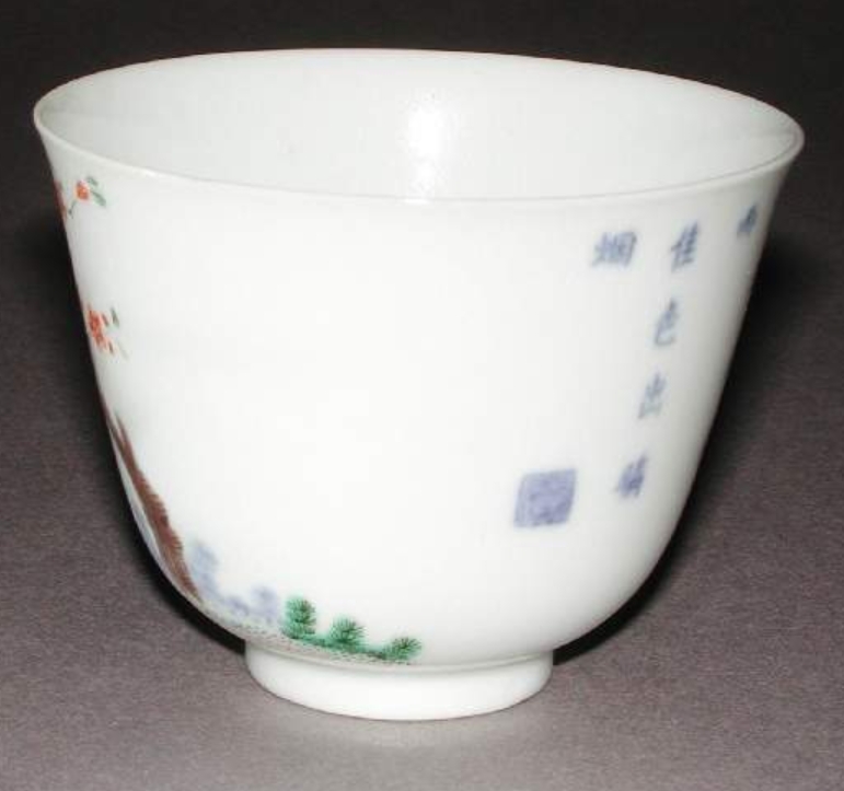 这是一件清代乾隆年间(约 1736-1795 年)的硬瓷月杯,直径 6.4 厘米,高 5.1 厘米。器形精巧,为敞口斜壁式,底部设小直足,属一对中的一件。采用釉下青花与釉上彩(红、紫褐、黑及两种绿色)装饰:内壁绘五月景致,以紫褐色绘海棠树干,铁红色绘海棠花,草地以铁红小点与黑色晕染的淡绿透明釉表现,旁有蕨类与藤蔓植物;杯身背面有两行十字符诗,末尾以釉下青花绘一方印章。整体工艺融合绘画与诗文,兼具实用与文人审美趣味。