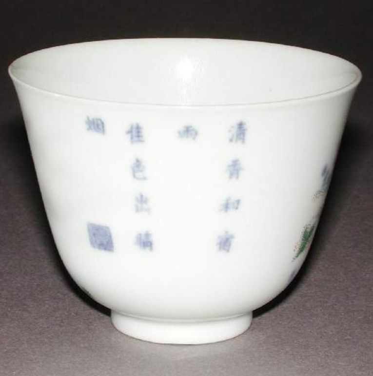 清代乾隆时期,瓷器工艺达到顶峰,“月杯”(十二月花神杯)是当时流行的茶具题材,每杯对应一个月份,以花卉、景致与诗句呼应月令,体现文人雅士对时序流转的细腻观察。这件五月杯以海棠花为主题,搭配诗句与印章,将自然意象、文学与工艺结合,反映了乾隆时期宫廷与文人阶层对 “诗书画印” 融合的审美追求,以及制瓷业对釉下、釉上彩结合技术的熟练运用。
