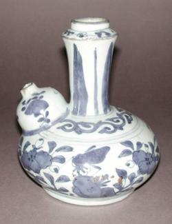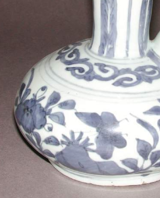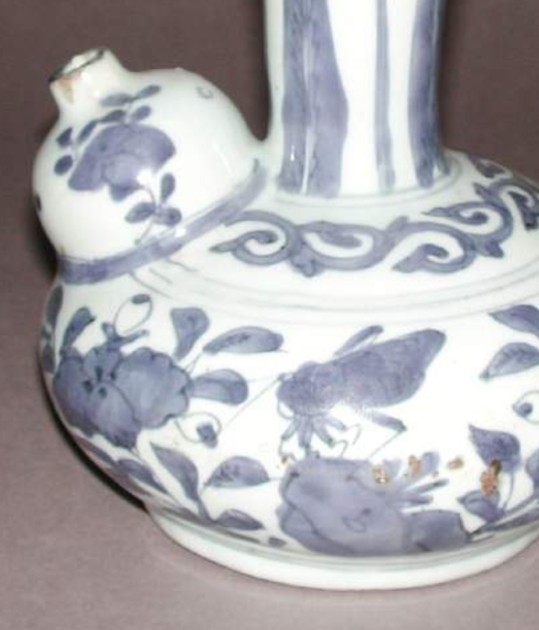 明代晚期青花瓷工艺成熟,青花发色稳定,纹饰题材多取材自然。这件军持的蝴蝶、蚱蜢、牡丹等纹饰,体现了明代民间对自然生灵的观察与艺术化再现,其造型与纹饰设计既符合实用需求,青花瓷壶的发展反映了中国陶瓷从釉下彩技术探索到成熟的全过程,是制瓷工艺进步的缩影。