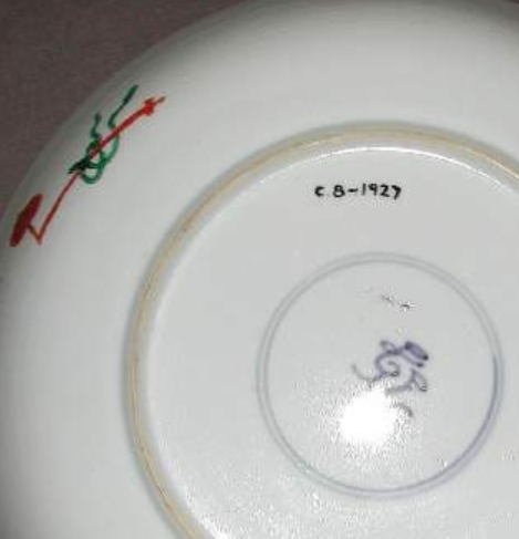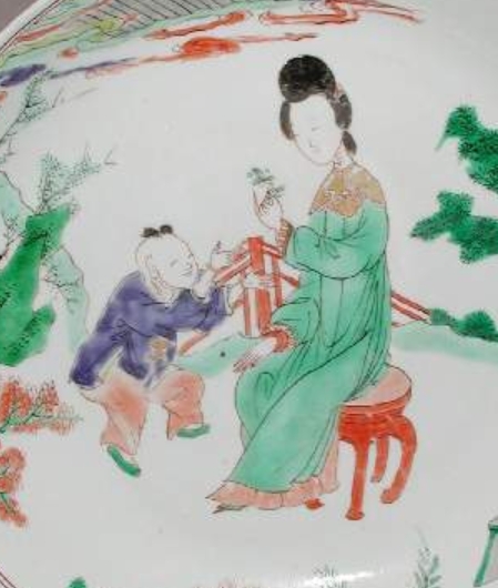 清代康熙时期,五彩瓷工艺达到鼎盛,“五彩”以丰富的釉色搭配金彩为特色,纹饰题材多取材于生活场景、吉祥图案。这件瓷碟中的人物纹(女子与男孩)是当时常见的 “婴戏” 类题材变体,象征家族兴旺;艾草叶、如意等纹样则承载着祈福避灾的吉祥寓意。同时,背面的纹章图案表明其可能为外销瓷,专为欧洲市场定制,反映了康熙时期中西贸易的繁荣 —— 中国瓷器通过海上丝绸之路远销欧洲,在满足实用需求的同时,也成为文化交流的载体,体现了当时制瓷业对国内外市场审美的适应。