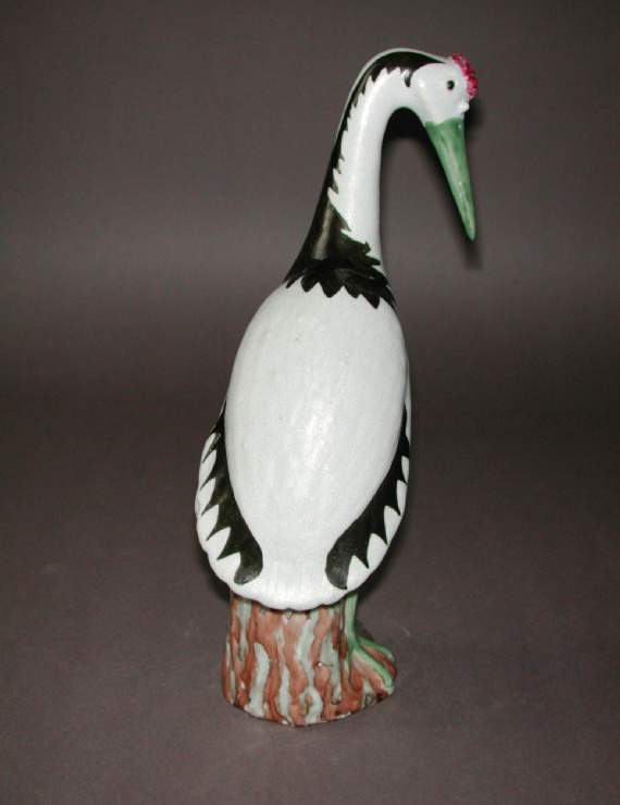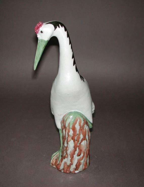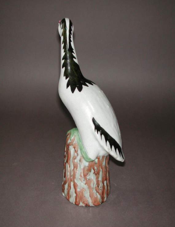清代乾隆时期,瓷塑工艺进入鼎盛阶段,动物造型瓷器因其精湛的工艺和吉祥的寓意,成为宫廷与民间追捧的陈设品。鹤在传统文化中是长寿、高洁的象征,常与松、石等元素组合,构成 “松鹤延年” 等经典吉祥图案,承载着人们对美好生活的祈愿。这件瓷鹤的制作工艺精细,色彩搭配和谐,刻划手法娴熟,不仅体现了乾隆时期制瓷业对自然物象的艺术化再现能力,也反映了当时社会对雅致生活与吉祥文化的追求,是清代中期瓷塑艺术与民俗文化融合的典型代表。