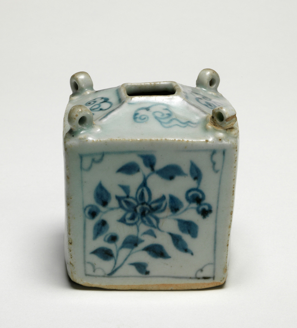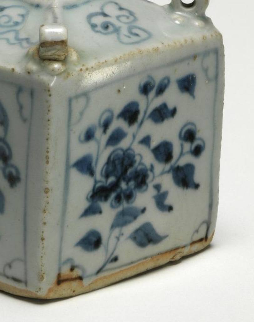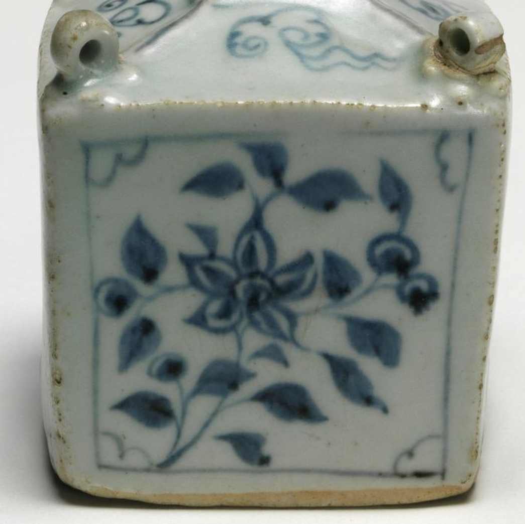 这是一件元代(1300-1368 年)的硬瓷长方体小罐,高 7.6 厘米,宽 7.2 厘米,为储物用器。罐身呈长方体造型,斜肩向上收至方形中心开口,四角各有一个环形耳(耳部立于小花饰上)。器身四面分别以釉下青花绘制不同花卉图案:两种牡丹、菊花配紫薇及射干;肩部饰云纹,棱边与中心开口边缘有线条纹装饰。罐身有一处烧制裂纹(延伸至底部),一角环形耳曾断裂后修复,同侧釉面有瑕疵,盛放于蓝色盒子中,附三个标签(分别标注收藏者、展览信息等)。整体造型独特,纹饰清晰,展现了元代青花瓷的典型工艺特征。