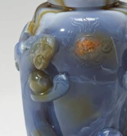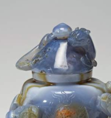 这是一件 19 世纪(1800-1900 年)的玉髓带盖瓶,高 13.7 厘米,宽 8.3 厘米,为陈设用器。瓶体与盖子均采用玉髓材质,整体造型规整,瓶身圆润,搭配相契合的盖体。器身以高浮雕工艺雕刻三条螭龙(猫科形态龙)环绕瓶身,龙纹线条流畅,姿态生动,凸显出玉石的温润质感与雕刻的层次感;盖子上亦雕有一条螭龙,与瓶身纹饰相呼应,形成整体和谐的视觉效果。玉髓质地细腻,色泽温润,雕刻工艺精湛,既展现了对传统龙纹题材的继承,又体现了 19 世纪玉石雕刻的精细水准,兼具艺术观赏性与文化象征意义。