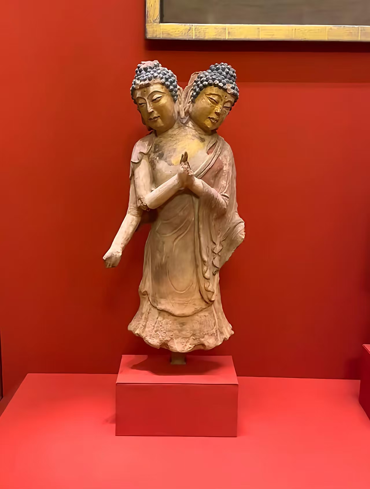 佛像造型独特,比例协调,高约62厘米。两尊佛头分别向左右微侧,面部丰满圆润,线条柔和,展现出慈祥、宁静的神态,雕刻细腻,充分体现了当时工匠对人物面部表情和神态的精准把握;头顶螺髻造型规整,排列有序;身披的袈裟衣纹流畅自然,褶皱表现生动,富有层次感,能够反映出当时成熟的雕塑技艺。