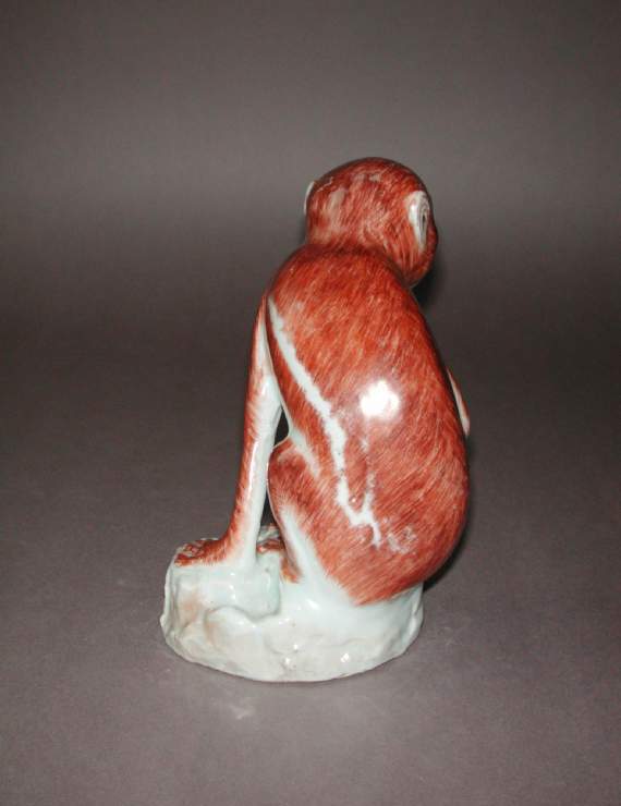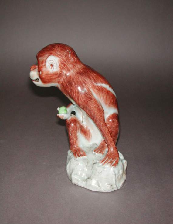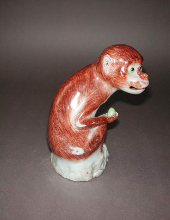 18 世纪的中国处于清代康雍乾盛世至嘉道时期,瓷塑艺术在这一阶段达到高峰,动物题材的瓷塑因贴近生活、寓意吉祥而广受喜爱。猴子在传统文化中常与 “侯” 谐音,象征仕途顺利、官运亨通,是民间喜闻乐见的吉祥题材。这件瓷猴采用单色釉装饰,属于当时流行的 “素三彩” 或单色釉瓷塑范畴,这类作品注重通过造型与釉色的结合展现艺术魅力,而非繁复的彩绘,反映了当时社会对 “雅俗共赏” 审美趣味的追求。同时,18 世纪也是中国瓷器外销的重要时期,动物瓷塑不仅供国内使用,部分还通过贸易流向海外,成为中西文化交流的载体,体现了清代制瓷业在满足国内需求的同时,对多元审美市场的适应。
