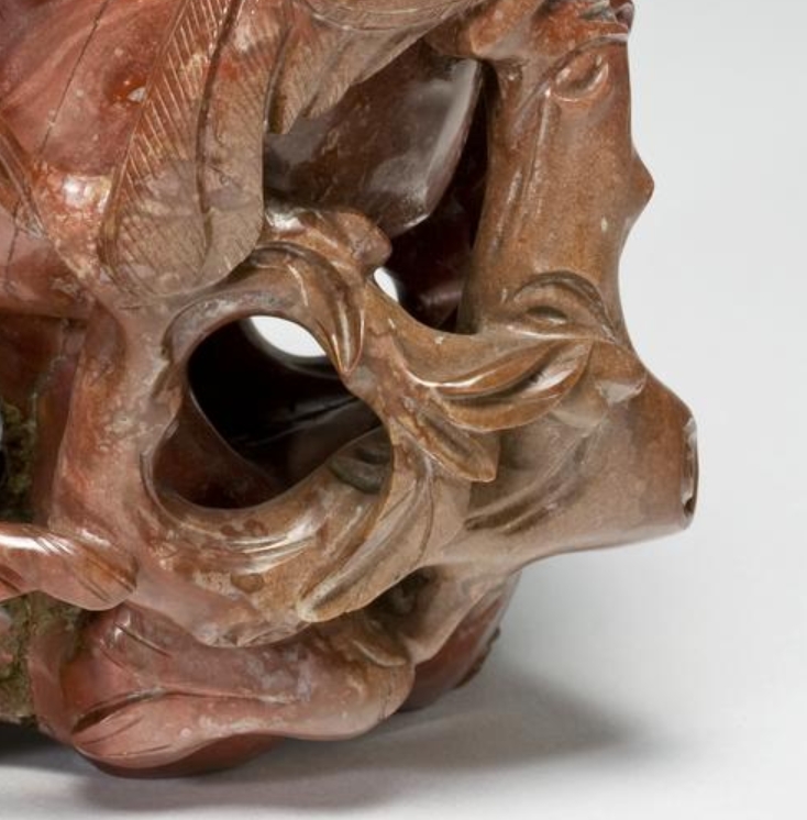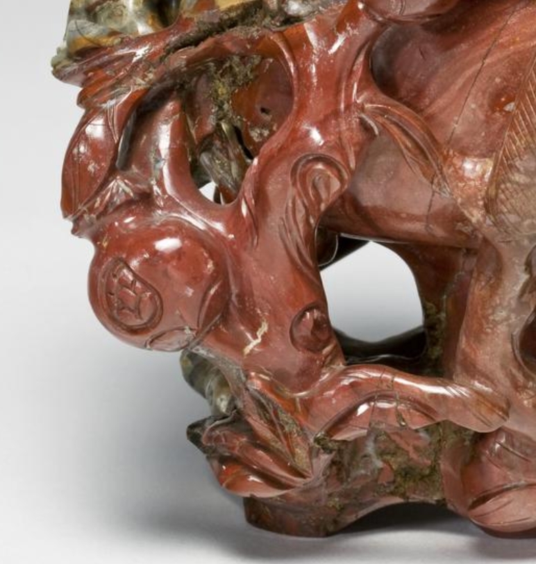 这是一件 19 世纪(1800-1900 年)的玛瑙花瓶,高 15.4 厘米,宽 12 厘米,为陈设用器。瓶体采用玛瑙材质,以圆雕工艺整体雕刻成缠绕的石榴树与两只鸟的造型,枝叶、果实与鸟的形态相互交融,线条流畅自然,细节刻画细腻,展现出对自然生物形态的精准捕捉。玛瑙质地温润,色泽随材质本身的纹理呈现自然变化,雕刻工艺精湛,使造型兼具立体感与生命力。底部阴刻 “乾隆年制”印章款,体现了对清代乾隆时期工艺风格的效仿,兼具艺术观赏性与工艺研究价值。