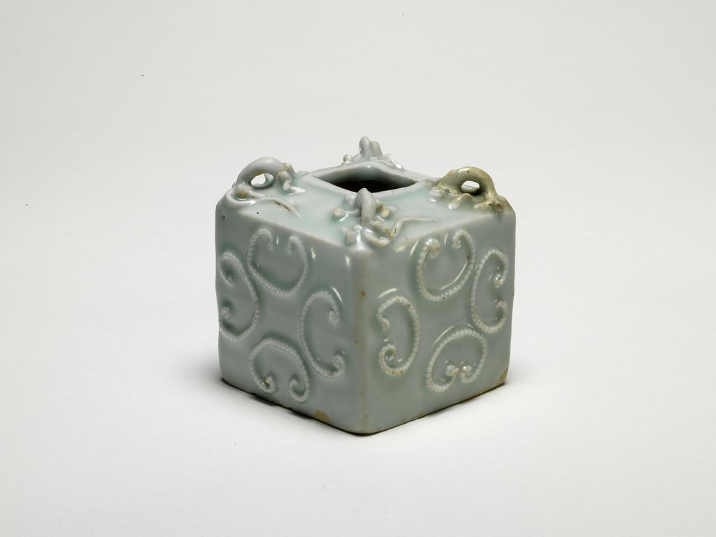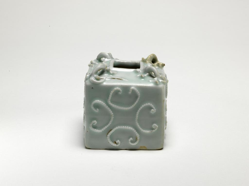 这是一件元代(1300-1368 年)的硬瓷长方体小罐,高 7 厘米,宽 7 厘米,为储物用器。罐身呈长方体造型,斜肩向上收至方形开口,四角各有堆塑的幼龙装饰,器身四面以浮雕工艺饰有四组 C 形串珠纹,纹饰立体生动。通体施淡青绿色青白釉,釉面温润透亮,凸显出瓷器的细腻质感。罐底无釉。其中一条龙纹经过修复,出现奶油灰色变色,整体虽有岁月痕迹,但仍展现了元代青白瓷的典型工艺特征,兼具实用功能与历史研究价值。