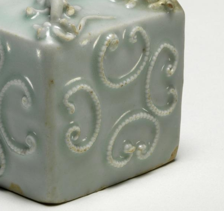 元代是青白瓷(影青瓷)持续发展的时期,景德镇窑作为青白瓷生产中心,在工艺上不断创新,堆塑、浮雕等技法的应用使器物更具装饰性。龙纹作为皇家与吉祥的象征,在元代瓷器中较为常见,幼龙造型灵动,体现了对祥瑞题材的偏好;C 形串珠纹则是元代民间器物的典型装饰,简洁而富有韵律。这类方罐造型独特,既适应储物需求,又因纹饰精美可能用于对外贸易,反映了元代景德镇窑兼顾实用与审美、满足国内外市场需求的生产特点,也见证了元代手工业与商品经济的繁荣。