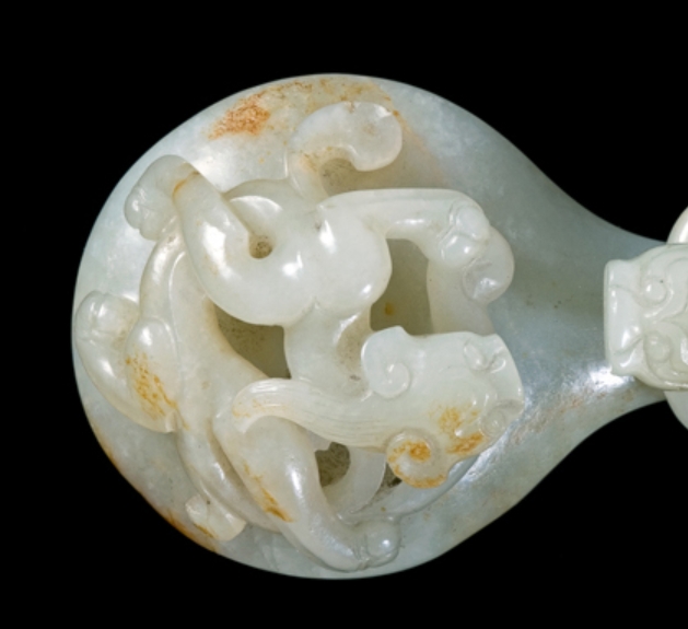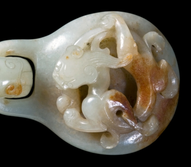 明代是中国玉器发展的鼎盛时期,和田玉(软玉)成为玉雕主要材质,透雕、浮雕等工艺成熟,纹饰题材注重吉祥寓意与权力象征。螭龙作为龙的变体,象征尊贵与吉祥,是明代玉器常见的装饰元素。玉带扣作为贵族服饰的重要配饰,不仅是实用器物,更是身份地位的象征,其工艺精湛程度直接反映佩戴者的社会等级。这件带扣的透雕螭龙纹与对称设计,体现了明代玉雕 “精雕细琢、纹饰繁而不乱” 的风格,同时,玉料上的褐色沁痕是岁月侵蚀的自然痕迹,为器物增添了历史厚重感,是明代玉器工艺与社会礼制文化结合的典型代表。