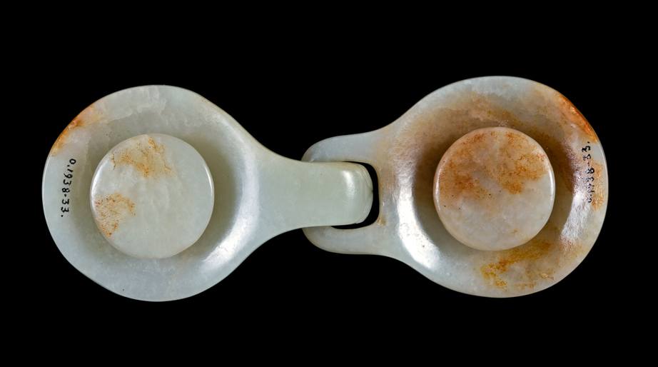 这是一件明代(1368-1644 年)的玉带扣,长 10.9 厘米,为服饰配饰用器。带扣由两块玉牌组成,材质为白玉,带有褐色沁痕,玉质温润细腻。其中一块玉牌雕刻有动物头部造型的弯钩,另一块则在异形环内设有穿孔,便于扣合;两块玉牌均以透雕工艺装饰螭龙(猫科形态龙)纹,龙纹线条流畅,造型灵动,透雕技法使纹饰突破平面限制,呈现出立体层次感。整体设计兼顾实用性与装饰性,既满足束带功能,又通过精美的玉雕彰显佩戴者的身份与品味,兼具工艺研究价值与文化象征意义。