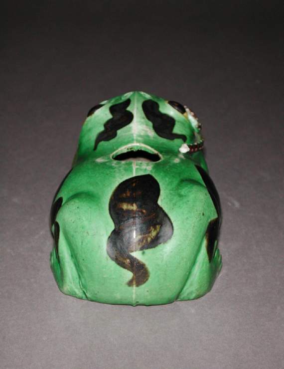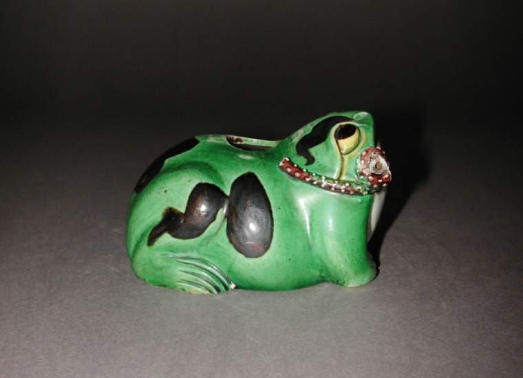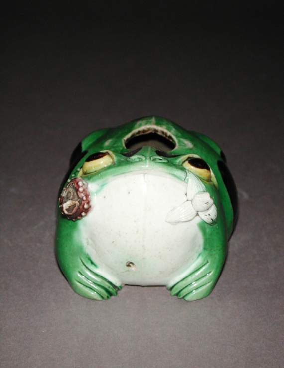 清代康熙时期是珐琅彩工艺传入并发展的重要阶段,珐琅彩因色彩鲜艳、附着力强,常被用于装饰瓷器。素胎珐琅彩(在未上釉的瓷胎上直接施彩)是当时的创新工艺之一,既保留了瓷胎的细腻质感,又能凸显珐琅彩的色泽。蟾蜍在传统民俗中象征吉祥(如 “蟾宫折桂” 寓意科举成功),作为瓷塑题材,反映了康熙时期民间对吉祥寓意的追求与生活题材的艺术化表达,同时也体现了制瓷工匠对自然生物形态的观察与再现能力。