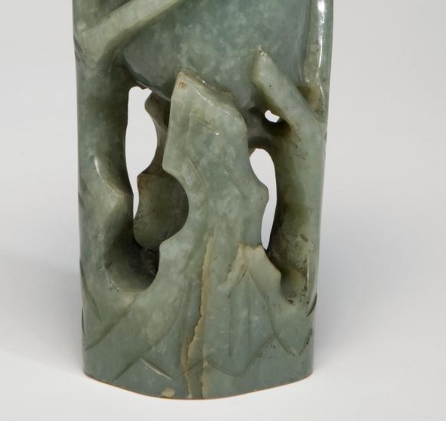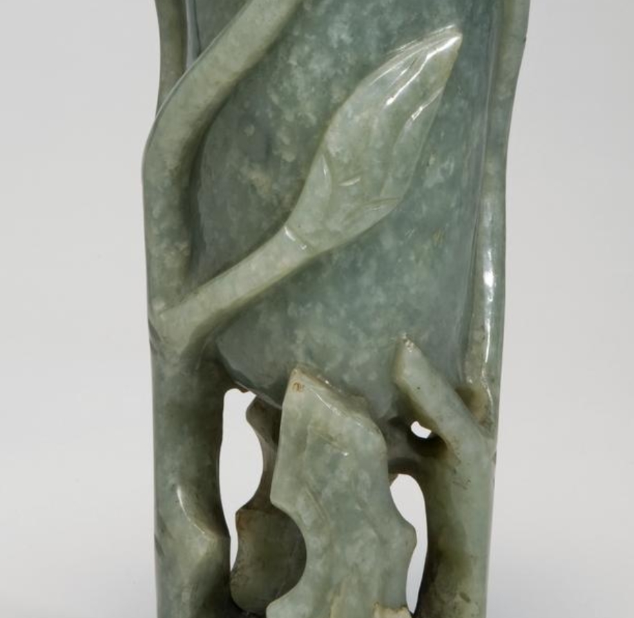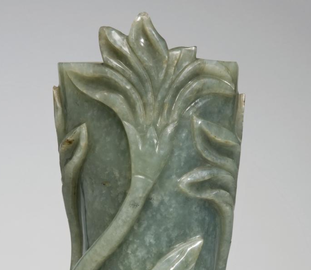 这是一件 15 世纪(1400-1499 年)的青玉花瓶,高 28.8 厘米,宽 9 厘米,为陈设用器。瓶体采用和田玉材质,整体呈瓶形,以雕刻工艺装饰莲荷纹(莲花与荷叶),纹饰线条流畅细腻,展现出对自然花卉形态的精准捕捉。青玉质地温润,表面遍布白色斑点,通过精湛的雕刻工艺凸显出玉石的质感与纹饰的立体感,既体现了对传统花卉题材的继承,又展现了 15 世纪玉雕工艺的精湛水准,兼具艺术观赏性与工艺研究价值。